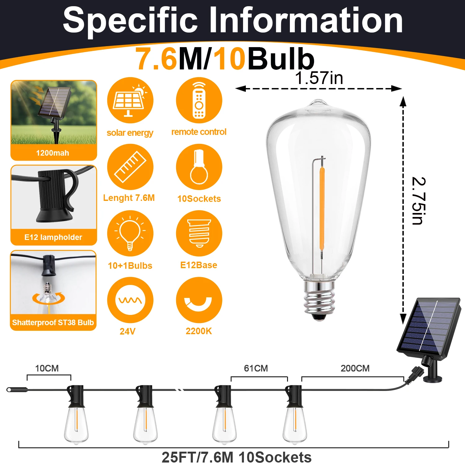 Solar G40 LED String Lights – USB Recharge, 8 Modes, Remote, Weatherproof